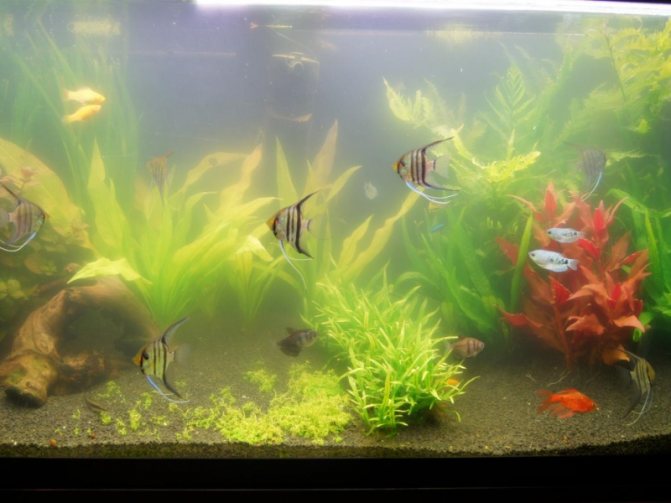 При загрязнении аквариума наблюдается появление слизи на растениях, зеленого налета на стеклах, вода становится очень мутной – зеленой с ярко выраженным тухлым запахом.
